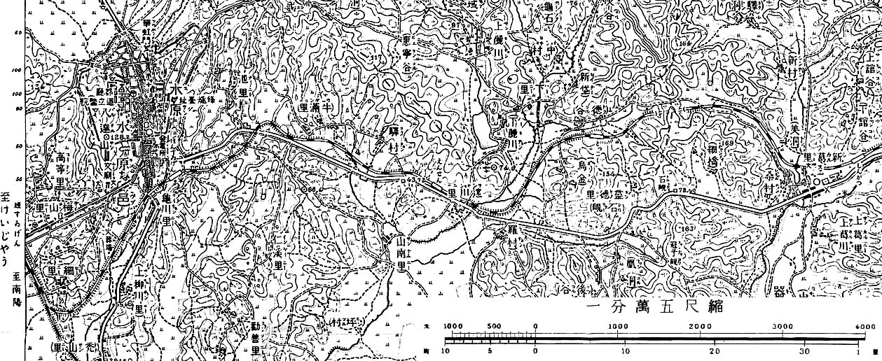 水原駅の列車用駅舎の裏の屋根の無い引き込み線のようなところから水仁線の列車が発車している(写真:上)。そして昔は水驪線の列車もここから発車していた。水原駅本駅に入っていないのは解放前まで私設鐵道であった名残であろう。水仁線が水原駅をでて少しすると大通りを越える。この辺りで水驪線は左へ別れていたはずである。ちょうどそこには細い道路が水仁線から岐れて行くので、それが水驪線の跡だと思われる。その道に沿って左にカーブしながら進むと、数百メートルで右から来る崩されかかった築堤の跡と合流する。この築堤の跡は水仁線と水驪線を結んでいた三角線の跡である。この三角線は水仁線が京釜線をオーバークロスするための大きなカーブの途中(写真:中)と、水驪線が本水原へ向けてのカーブが終わるところを結んでいた。三角線と合流した水驪線は築堤の上にコンクリートを搭せた形の道路に変わり水原川近くまで続いていた。しかし水原川の橋梁跡は何も見付けることはできなった。この川を渡るとすぐに本水原駅(後の華城駅)があったずだが、この辺りは李朝時代の城郭都市の中心地、つまり旧市街に近いために住宅が密集していたり、華城市場という大きな市場があって思うように調査が出来なかった。更にこの後、私は道を勘違いして元の位置に戻るまでに約2時間のロスをしてしまった。何とも情けないことである。元の位置に戻り更に廃線跡を歩き始めたが、しばらくのあいだ遠川遊園地の辺りまでは廃線跡は見付けられなかった。遠川駅も同様である。私が歩いたのが5月5日で、韓國でも子供の日の祝日のために遠川遊園地は物凄い混雑であった。遊園地を過ぎて遠川橋を渡ると国道から左へ別れる泥道を見付けた(写真:下)。もちろん水驪線跡である。ここから新葛まで約5kmは国道から離れて山を巡回することになる。廃線跡は泥道として続き、途中の徳谷駅はその道の脇に用地の広がりが在るだけで跡形はなかった。徳谷駅を過ぎて1km程進むとトンネルがあったはずであるが、ここは新規にレジャー施設の開発が進行中であり、工事によってトンネルのあったところまで立ち入ることが出来なかった。仕方なく少しだけ道を戻って山の上に出来たゴルフ場の中の私道を通って山の反対側まで行った。しかし残念なことに反対側のトンネル入り口も埋められていた。埋められたトンネルから続く道床跡の泥道を廃線跡特有の曲線を感じながら歩くと前方に京釜高速道路が見えてきた。高速道路の下をくぐって新葛の街へ入ると旧線跡は町中の道路となって鉄道の面影は薄くなった。そして新葛駅は街の東の外れにあったはずであるが、確かな駅跡の証拠を見付けることは出来なかった。