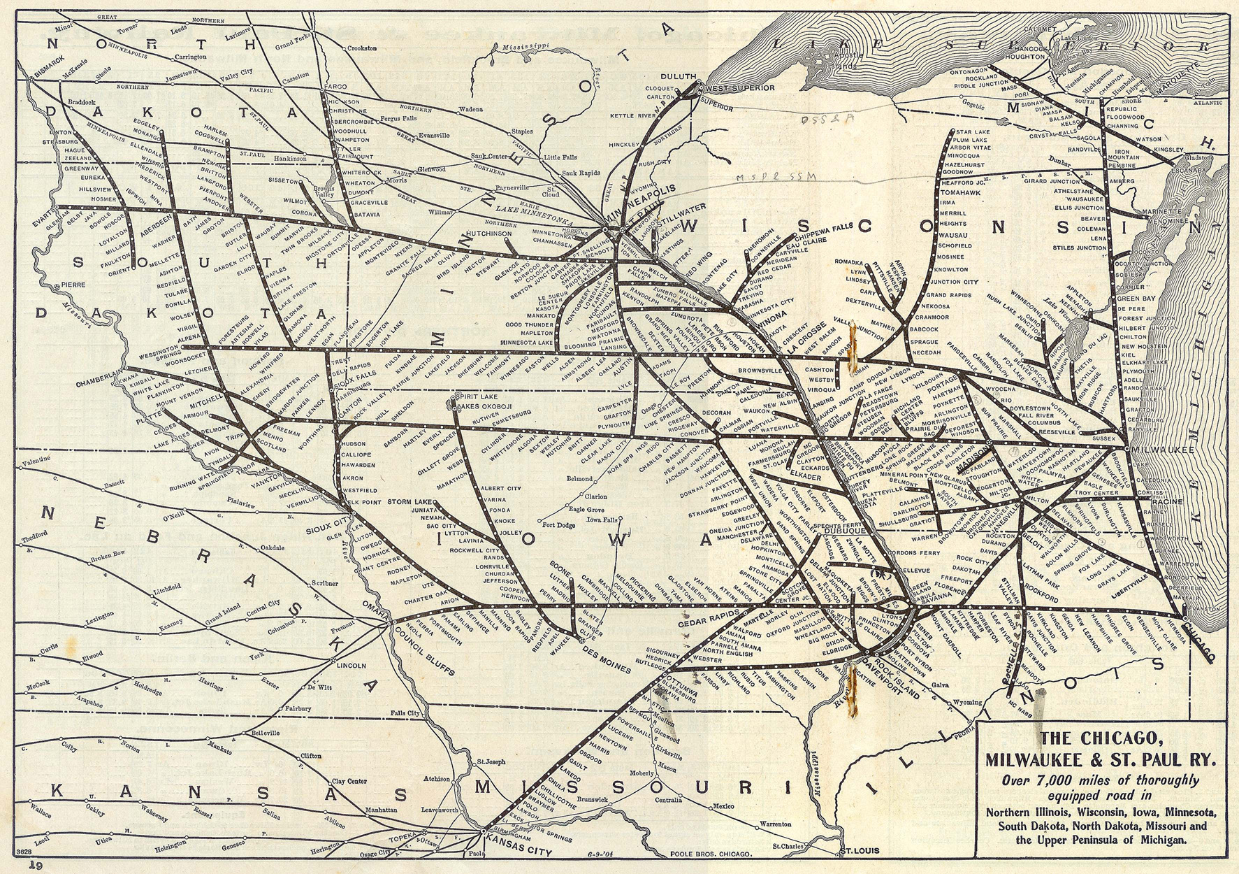 セントポール・シカゴ鉄道 (St.Paul & Chicago Railroad) が、最初の20マイルを開業させたのが、1869年12月13日であった。ここ ヘイスティングス がそのときの終点であり。徐々に南に建設されていった・1876年には、ミシシッピ川を、ラクレッセント (La Crescent) で渡って ウィスコンシン州 に入って行った。一方、ヘイスティングス・ダコタ鉄道 (Hastings & Dakota Railroad) は ヘイスティングスから西へ建設が始められて、1868年は ファーミントン (Farmington)、1878年には モンテビデオ (Montevideo) そして、さらに延長されて、1909には、シアトルに達して大陸横断ルートとなって行く。しかし、1880年には、ベントン・ジャンクション から ミネアポリス へ向かう新線が建設され、ほとんどの列車は、H&D の旧線区間を使用しなくなった。