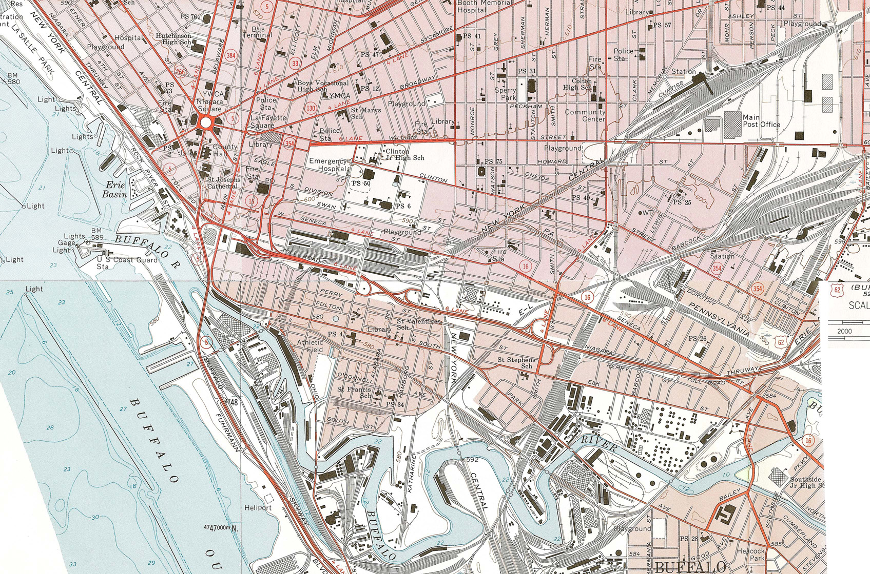 バッファロー 上左:セントラル・ターミナル駅 (絵葉書) 上右:空家だが建物は残っている。1994年8月撮影 右中: セントラルターミナルの全盛期(NYC's Stations and Terminals, G.H.Doughty,TLC publishing Inc., 1999) 右下: アムトラックのエクスチャンジ街駅 1994年8月撮影 下: USGS 1:24,000 1965年測量