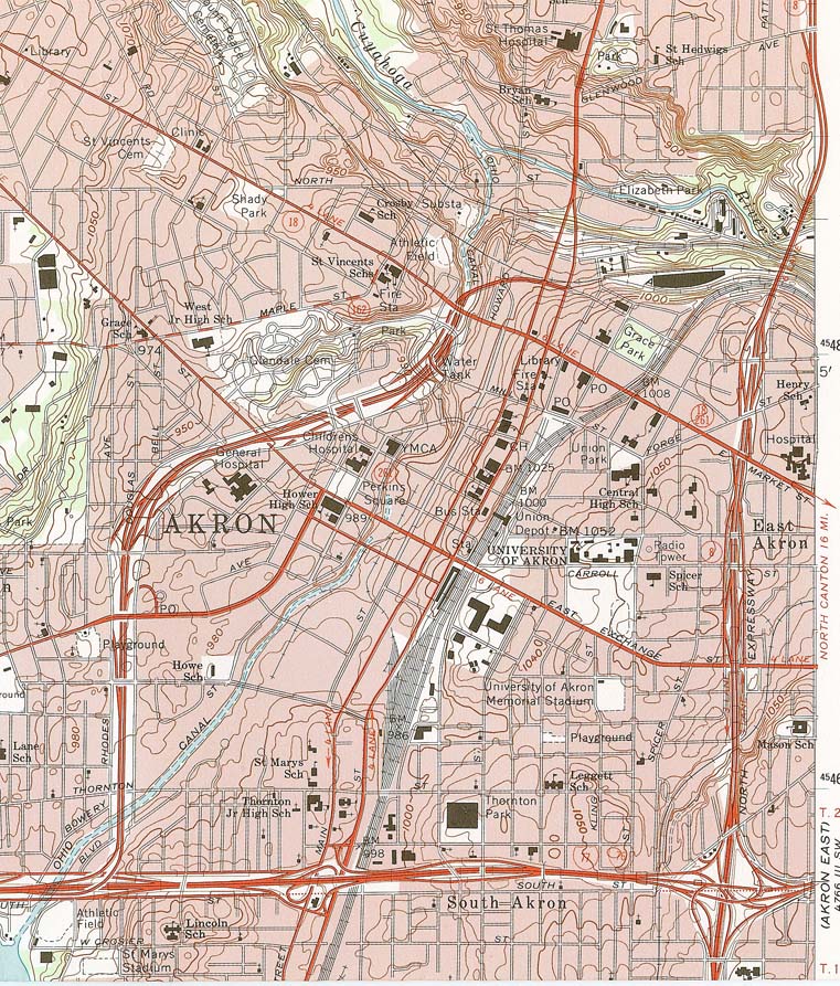 ユニオン駅では、これらの3鉄道の列車を停車場として利用されていた。現在は、アクロン大学 (University of Akron) があるところがかつてのユニオン駅の位置であり、その建物は 1950年 に建設された最後のユニオン駅の駅舎である(http://www.west2k.com/ohio.htm)