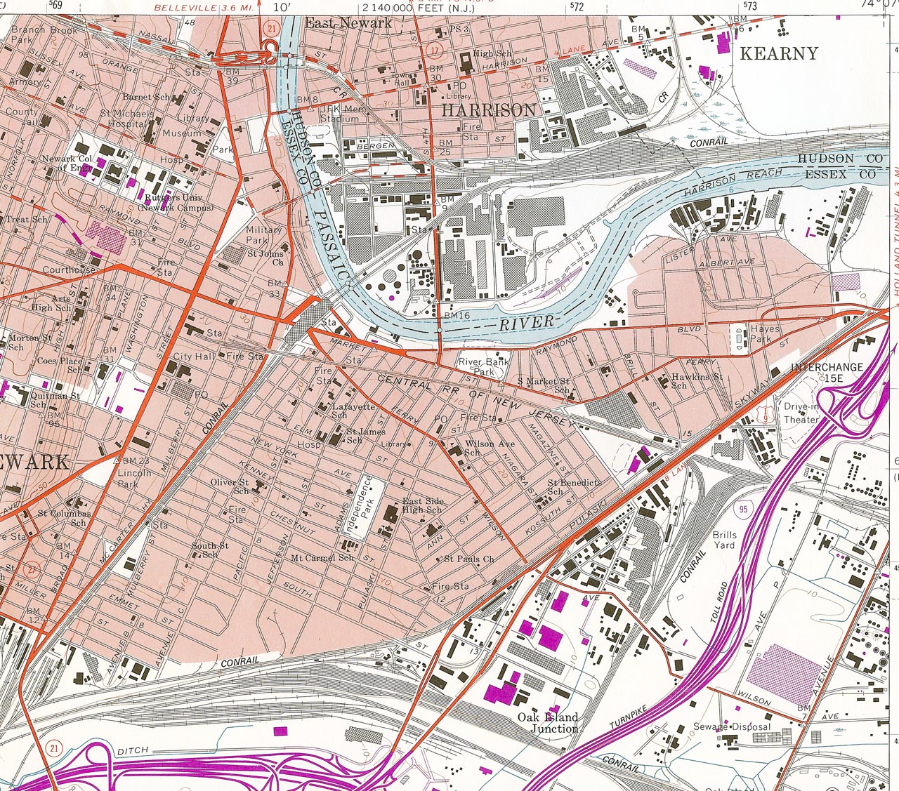 ニューアークのCNJ駅は、ダウンタウンのブロード街に置かれ、一時は4線発着の停車場で、ジャージーシティー行き、エリザベス行きの列車がそれぞれ30分間隔で発着していた。1960年代になって、PATHが開通してこの直接ルートの必要性もなくってきた。ジャージーシティーのCNJ駅と連絡船は 1967年4月30日を以って廃止され、CNJの列車はペンシルバニア鉄道のニューアーク駅を始発終着駅に変更された。