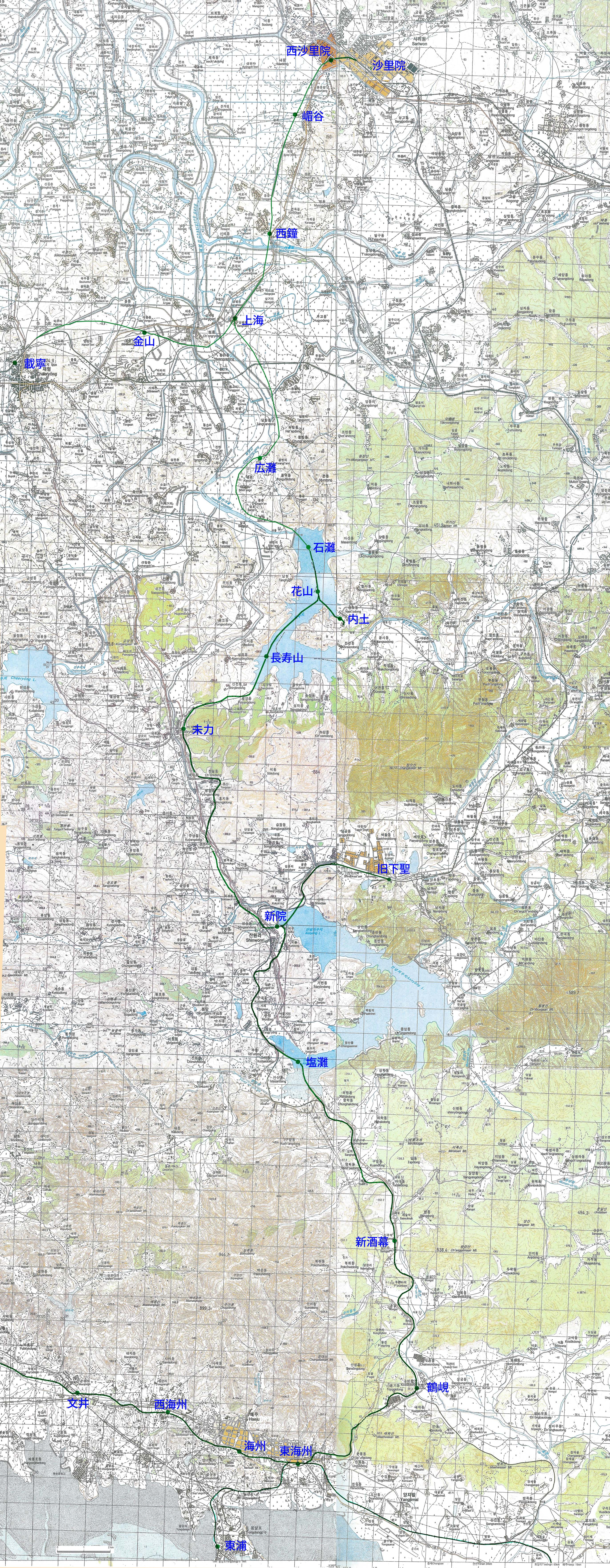 沙里院からの狭軌線は、動乱後、標準軌に改軌されたが、昭和19年に開通した 沙里院=下聖間の標準軌線が新院経由で延長され、長寿山経由の路線は貯水池に沈み廃線となっている。鶴{山見}から東海州へは途中トンネルを含む勾配区間であったが、現在は東に大きく迂回するルートに付け替えられている。