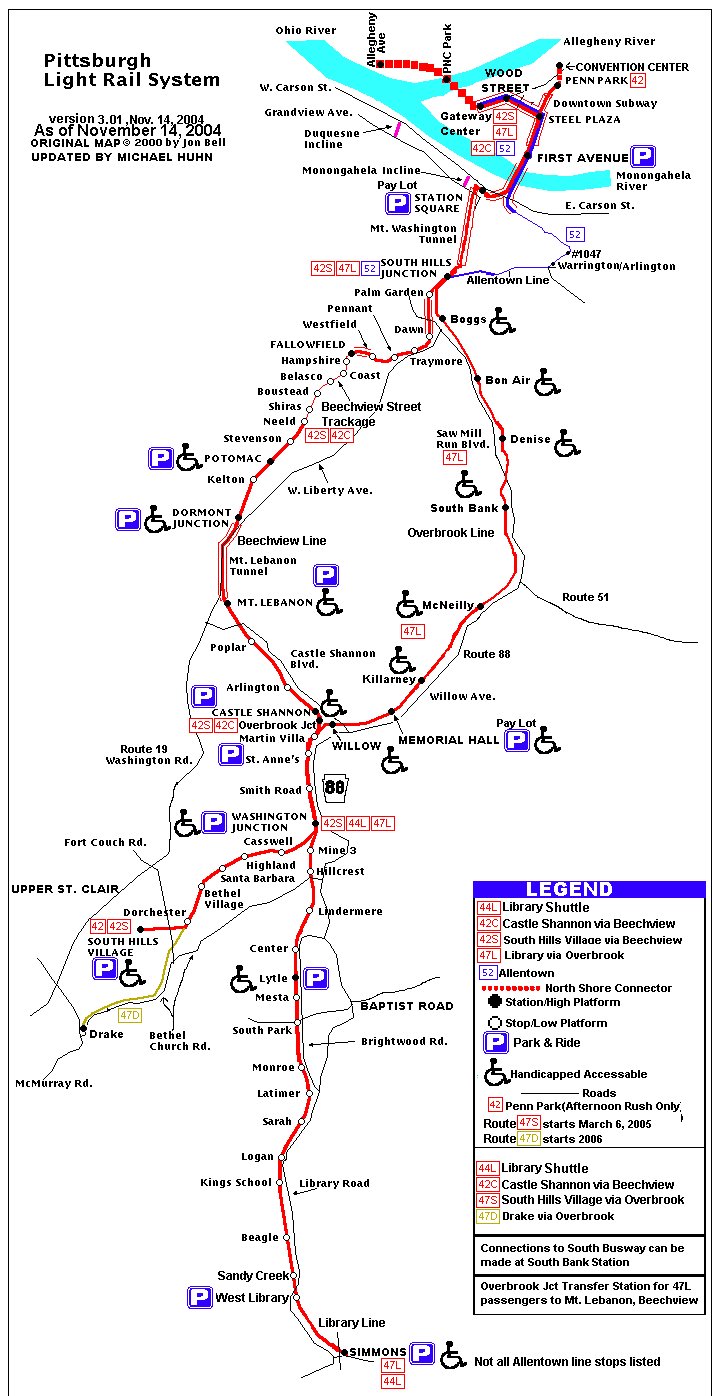 Penn駅 から P&LE駅 の間は、標準鉄道の大型の橋で河を渡る。そしてそこから道路との併用軌道のトンネルで郊外へと抜けていく。1997年8月撮影