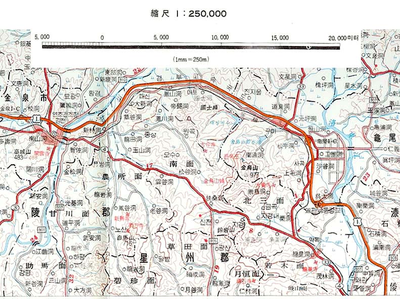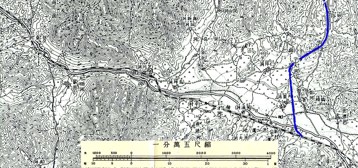 廻り距離こそは25.9kmとかなり短いがその分勾配はきつかった。現在線が若木駅を過ぎ亀尾駅に向って右に進路を変えるところが旧線との分岐点であった。旧線は今はその上に敷かれた国道に殆どの区間が隠されてしまっている。ただこの区間唯一の途中駅であった金烏山駅が置かれていた扶桑洞の集落の辺りだけは、その国道の改良が旧道を使って行なわれたために旧京釜線跡が国道の下に埋まることだけは避けられた。それ故この区間唯一のトンネル、扶桑隧道(370m)がここに残されていたのである。確認できたのはその若木駅側入口だけだったが、76年も前に廃線となったトンネルである、よくも残っていてくれたものだ。しかし此の辺りにあったはずの金烏山駅の跡形は何も見付けることが出来なかった。
