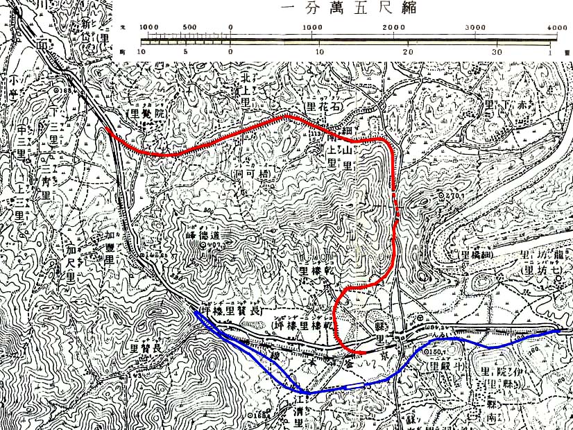 に進路を北へ90度変え峠へ向うという大迂回をして勾配を20/1000に抑えていた。峠には 長さ290m程の亀卜隧道を掘り、面境を越えて緩やかに築堤を下って沃川駅へと向っていった。1919(大正8)年の京釜線改良工事ではこの急勾配急曲線の迂回路の付け替えが主題とな