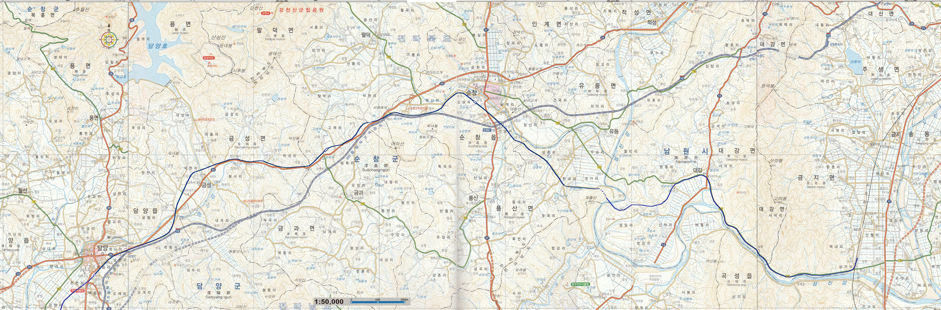淳昌の駅跡を過ぎると、小道となった路盤跡は高速道路と交差し、先程から平行していた国道とも別れを告げて金池へと向かっていく。淳昌から先は平行する道路も無く、この路盤跡だけが進んでいくことになる。金池は大きな集落ではなく淳昌との関わり合いも多くはないので道路はみな南原の方に向かってしまっている。鉄道はより平坦な地形を望んでこのルートを選んだのであろう。路盤は全羅南北道の境界となっている蟾津江の渡江地点へ向かって南東に進む(写真1)。佳南里に差し掛った所で沙川に出くわした。橋の跡があり橋台と橋脚が残っていたが橋桁はなかった(写真2)。つまりこの川が渡れなかった。しかたなく大きく遠回りして上村里にでてその先に進んだ。寺院なのだろうか韓国の伝統を感じる古い建物がをふりかえって写真を一枚(写真3)。
