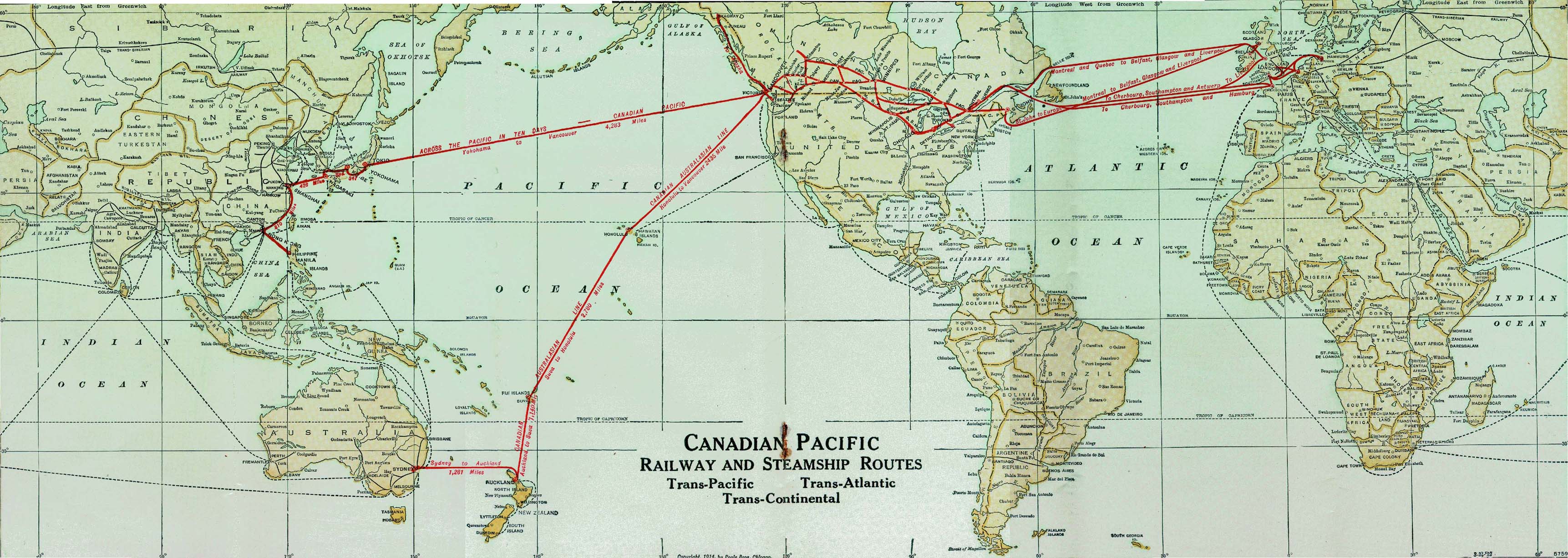 カナディアン・パシフィック鉄道は大陸横断鉄道を1886年完成し、7月4日最初のモントリオールからの列車が太平洋連絡終着駅ポートムーディーに到着した。1887年5月には鉄道はバンクーバーまで延長され、その先は太平洋を横断して極東の英国植民地・香港まで海路で結ぶというのがカナディアン・パシフィック鉄道の構想であった。しかし、初めは全くの別会社のカナディアン・パシフィック汽船(Canadian Pacific Steamship、CPS)が汽船運航をし、鉄道会社直営のカナディアン・パシフィック鉄道郵便汽船会社(Canadian Pacific Railway's Royal Mail Steamship Line)となるのは1891年のエムプレス船団の就航の時からである。ともあれこの航路の第一船パーシャは1887年6月12日香港からの航海を終え、バンクーバーに到着した。極東-英国の所要日数はスエズ運河経由のP&O船隊より短縮されので、1887年12月英国及びカナダ政府は郵便輸送助成金交付を決定し、これを使ってエムプレス船団が建造された。第一番船となったのはエムプレス・オブ・インディア、1891年2月8日英国リバプールを香港に向けて出航した。太平洋航路に就航するための回航の便乗客扱いで世界一周をうたったものであった。香港からは太平洋航路定期便として、4月7日出航した。姉妹船はエムプレス・オブ・ジャパンとエムプレス・オブ・チャイナで5900トン、仮装巡洋艦への変装にも対応した高速船で最高速18.65ノットを記録している。2本煙突に3本マスト、帆走機構も備え、船首像もついたクラシックで優美な船影であった。横浜-バンクーバー間はおよそ11日で航行した。
