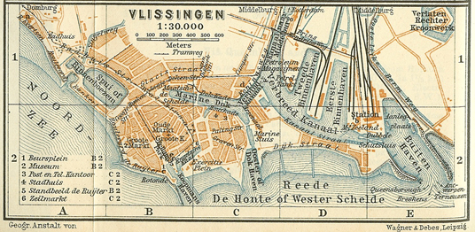 ブリシンゲン (Vlissingen, Flussingn(蘭)) は、1876年、英国の クイーンズバラ(Queenborogh)との間に鉄道連絡船の就航が開始され、1927年からは英国側の相手港が ハービッチ(Harwich)に変更されている。クイーンバラ鉄道桟橋の度重なる火事により設備の損壊によるものであった。
