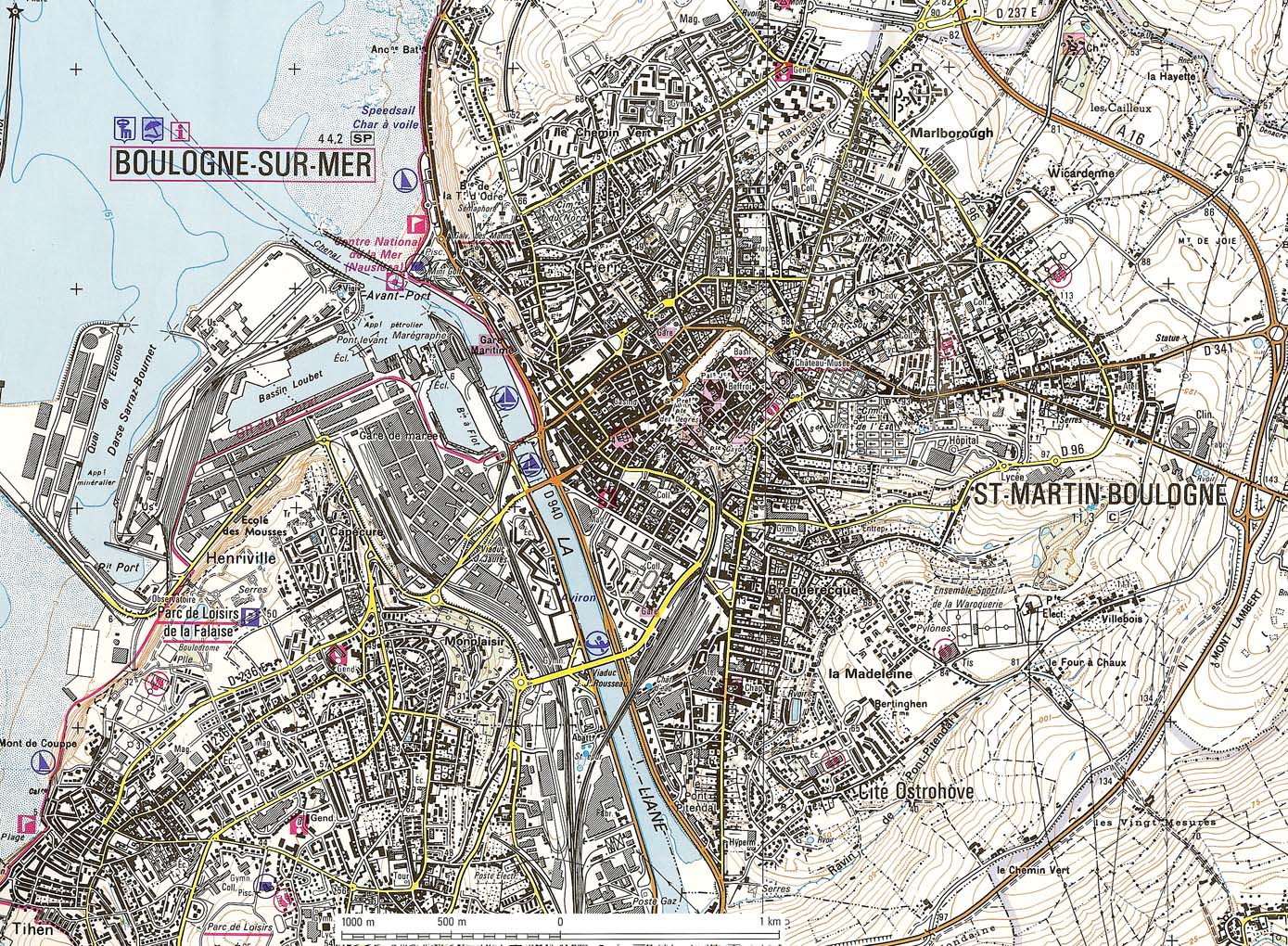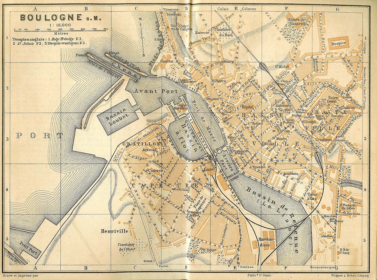 ブローニュの中央駅は、ブローニュ・ヴィル駅と呼ばれ、Liane川の左岸に設けられていた。駅舎の建設が始まったのが 1853年で、1855年に完成したもので、終端駅の構造になっており、アミアン(Amien)方面とカレー(Calais)方面へ直通する場合は方向転換が必要であった。この駅舎は第二次世界大戦で焼失し、戦後の復興では、Liane川の改修とあわせて、駅の位置が変更され通過側の駅になった。ロンドン・パリ間の華列車「ゴールデンアロー」号、第二次大戦前ではパリからの列車がブローニュー、パリへの列車はカレーが連絡船との連絡駅であった。戦後の列車は、上下ともカレーが接続駅となっている。