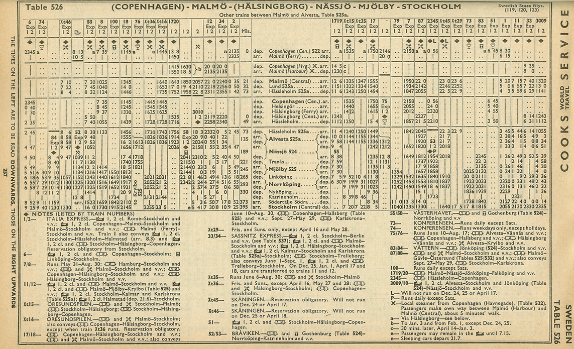 ストックホルム方面行きの列車は、マルメ発、コペンハーゲン発の両方があり、コペンハーゲン発の列車は、ヘルシンオア=ヘルシンボリ間の連絡船で車両航送されている。夜行の2列車はローマ=ストックホルム間のイタリア急行 (Italia Express) で、コペンハーゲン=マルメ間で車両航送され、別にコペンハーゲンを発車し、ヘルシンオア=ヘルシンボリ間で車両航送された 4列車と、ヘッスルホルム (Hässleholm)で連結されて、ストックホルムに向かっていた。