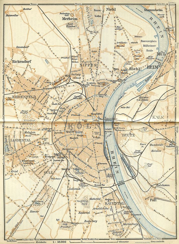 ケルンの中央駅ができたのが、1859年、それまでの行き先別の5つのターミナル駅を統合したものであった。中央駅の対応容量が満杯になり建て替えが必要になり、1894年に2代目の駅舎が完成した。第二次大戦で破壊された駅舎は、徐々に再建が行われ、1957年にガラス張りの正面玄関が印象的な3代目駅舎が完成した。