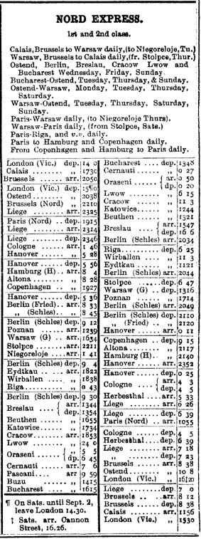 北急行(Nord Express) は、1896年にワゴンリ社によって運転が開始された。パリとオステンドを基点にして、ブリュッセル(Brussels)、ケルン(Koin)、ハノーファー(Hannover)、ベルリン(Berlin)、ケーニスベルグ(Konigsberg,(現)カリーニングラード)を経由し、ヴィルバーレン(Wirballen)でロシアに入るルートでロシアの首都サンクトペテルブルグ(St.Petersburg)までの運転であった。1899年には付属編成がワルシャワ迄行くようになり、モスクワまでの広軌区間にも1909年からワゴンリ社の車輌が運行するようになった。