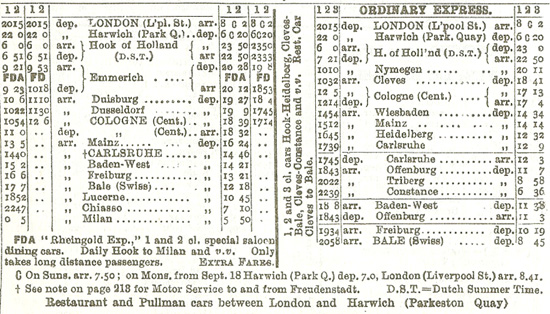 ロンドン連絡の フーク・ファン・ホーラント発着の車両は、ユトレヒト(Utrecht) で、アムステルダム発着の車両と連結されて、エマーリッヒ(Emmerrich)でドイツに入る。ケルンからはライン川左岸を走り、マインツからは、第一次大戦前の主経路であるライン川左岸のストラスブール経由の路線から離れ、右岸に転じ、カールスルーヘ(Karsruhe) を経由して、バーゼル(Basel)SBB駅に到着する。1939年5月15日には、ゴッタルド隧道を超えてミラノまで延長されているが、その年の8月22日には、欧州大戦前夜の国際関係悪化により、ドイツの長距離急行はすべて運休となってしまった。