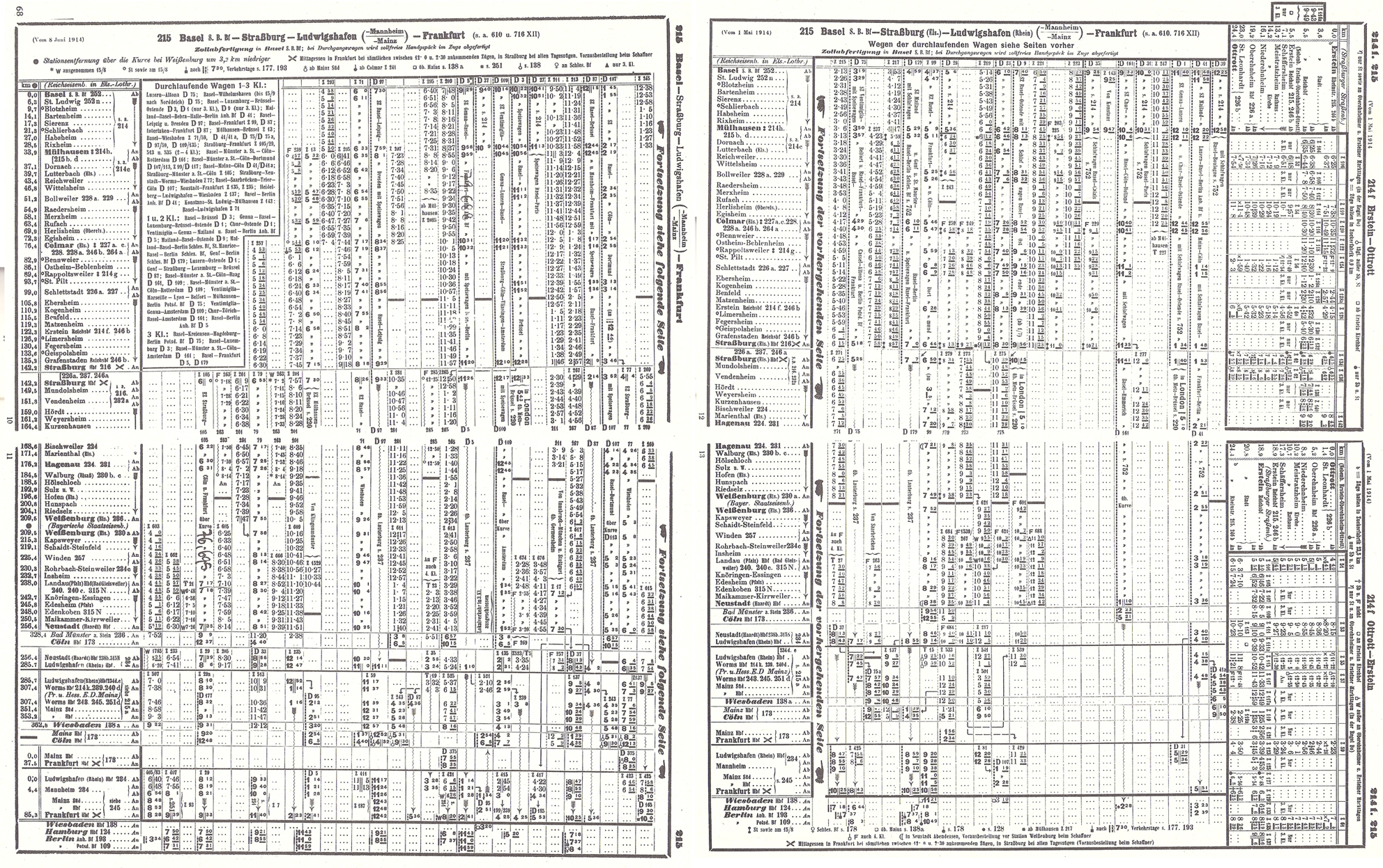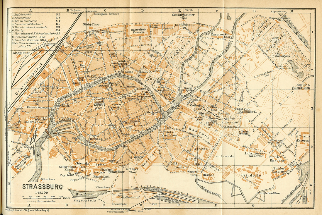 シュトラスブールでの最初の鉄道は シュトラスブール−バーゼル鉄道で、シュトラスブール側の基点は Koenigshoffen 、 バーゼル側の終点は St. Louis におかれ、1841年8月に開業している。バーゼルの城内に駅が開設されたのは、1845年であった。シュトラスブール側は1846年に城内に駅が設置された。パリからの パリ−シュトラスブール鉄道 (Compagnie du chemin de fer de Paris a Strasbourg) の最後の開通区間の ナンシー−シュトラスブール間の 1852年の開通により、パリ線・バーゼル線と共通の駅が Place des Halles と呼ばれる一角に 1854年に設置され、最初の中央駅となった。1872年の普仏戦争後は、アルザス・ローレンヌ地方とともに東部鉄道の該当区間もドイツに割譲され、ドイツ帝国直轄の アルザス・ロートリンゲン鉄道 となり、第一次大戦までのドイツ統治時代には、現在の中央駅が 1898年、ドイツ風の ネオ・ロマネスク様式の面持ちで完成した。