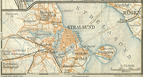 下:1927年時刻に、埠頭駅 (Stralsund Hafen) が見える。