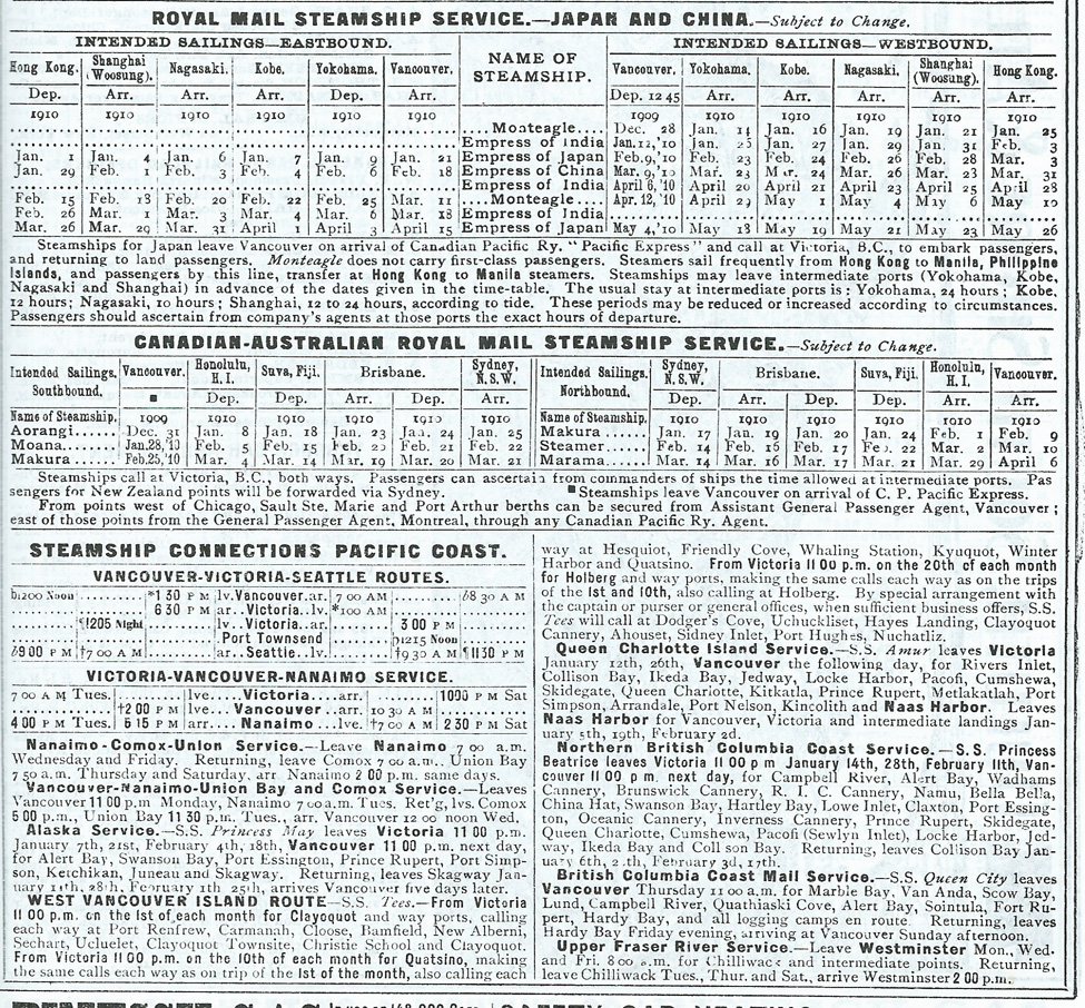 上:1914年に完成した駅舎と海陸設備、ノースバンクーバーへの渡船 中左:1928年の桟橋の地図 中右:バンクーバー桟橋の カナパシ汽船太平洋線 エムプレス・オブ・インディア 下左:バンクーバー桟橋のアラスカ行きクルーズ客船 (1995年撮影)下: 1910年 太平洋航路汽船予定表