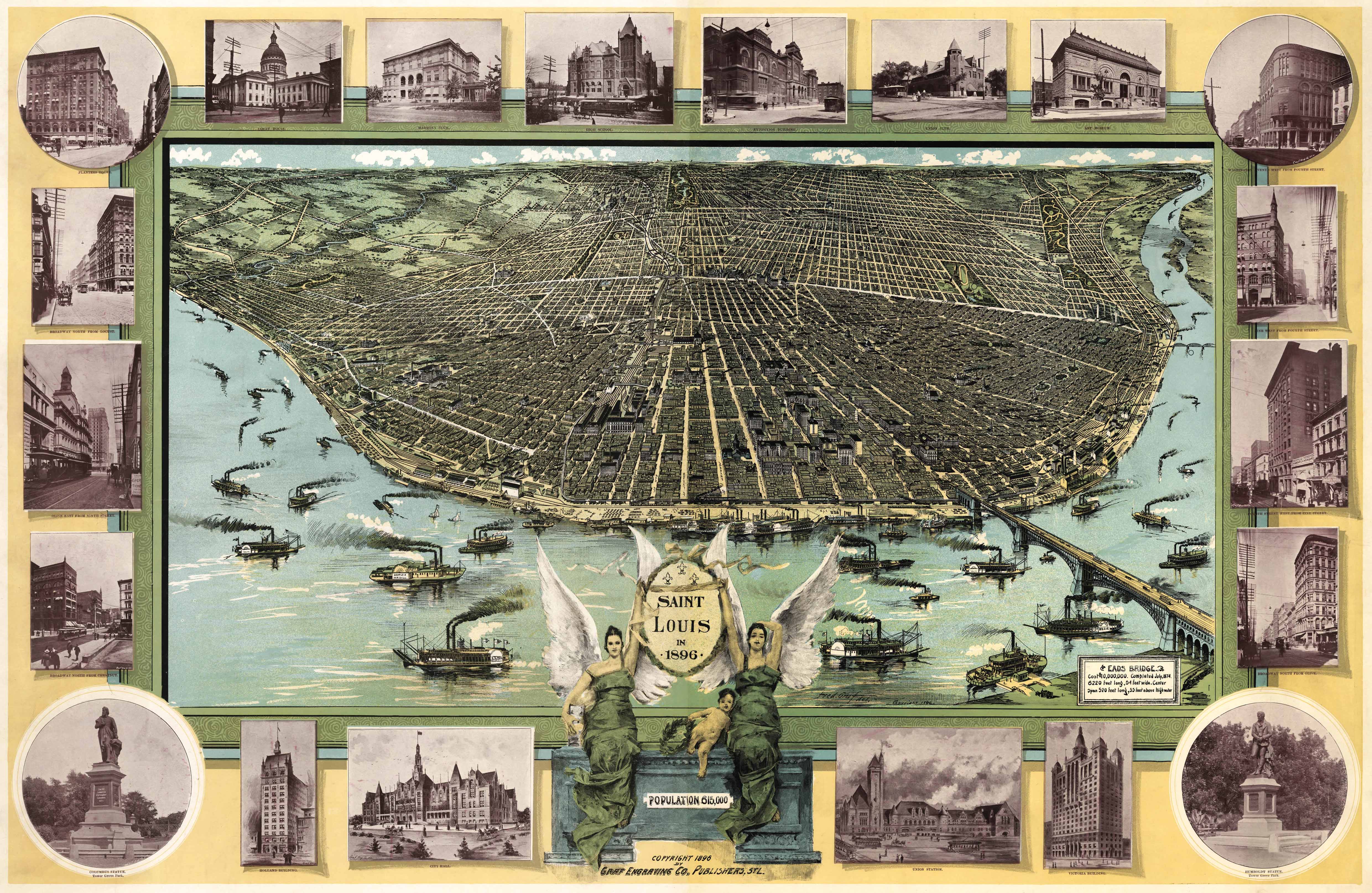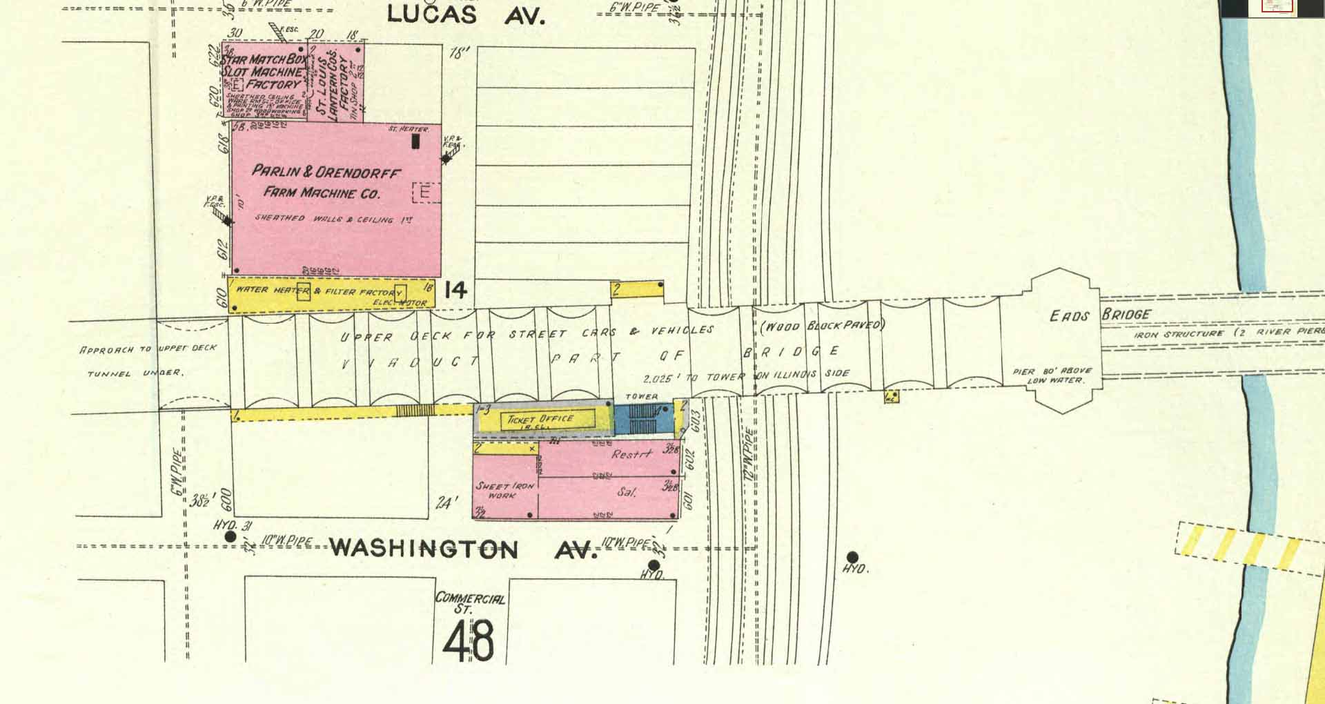 ワシントン街を跨ぐ高架橋はマーチャント橋へ、そして、イーズ橋の中にも線路があり、両方で乗降できる形でワシントン街駅があった。(上:1896年鳥瞰図、1909年地図、1910年時刻表 Wabash RR, □印がマーチャント橋経由、East St.Louis を通るのがイーズ橋経由)