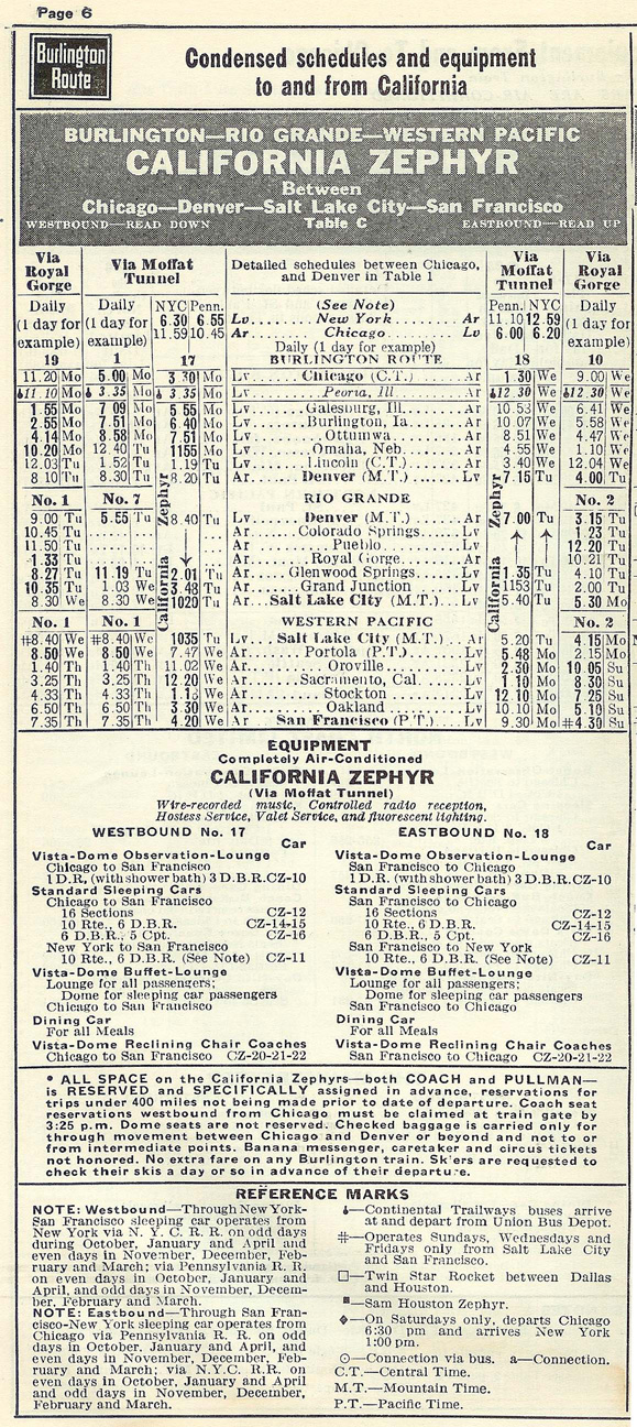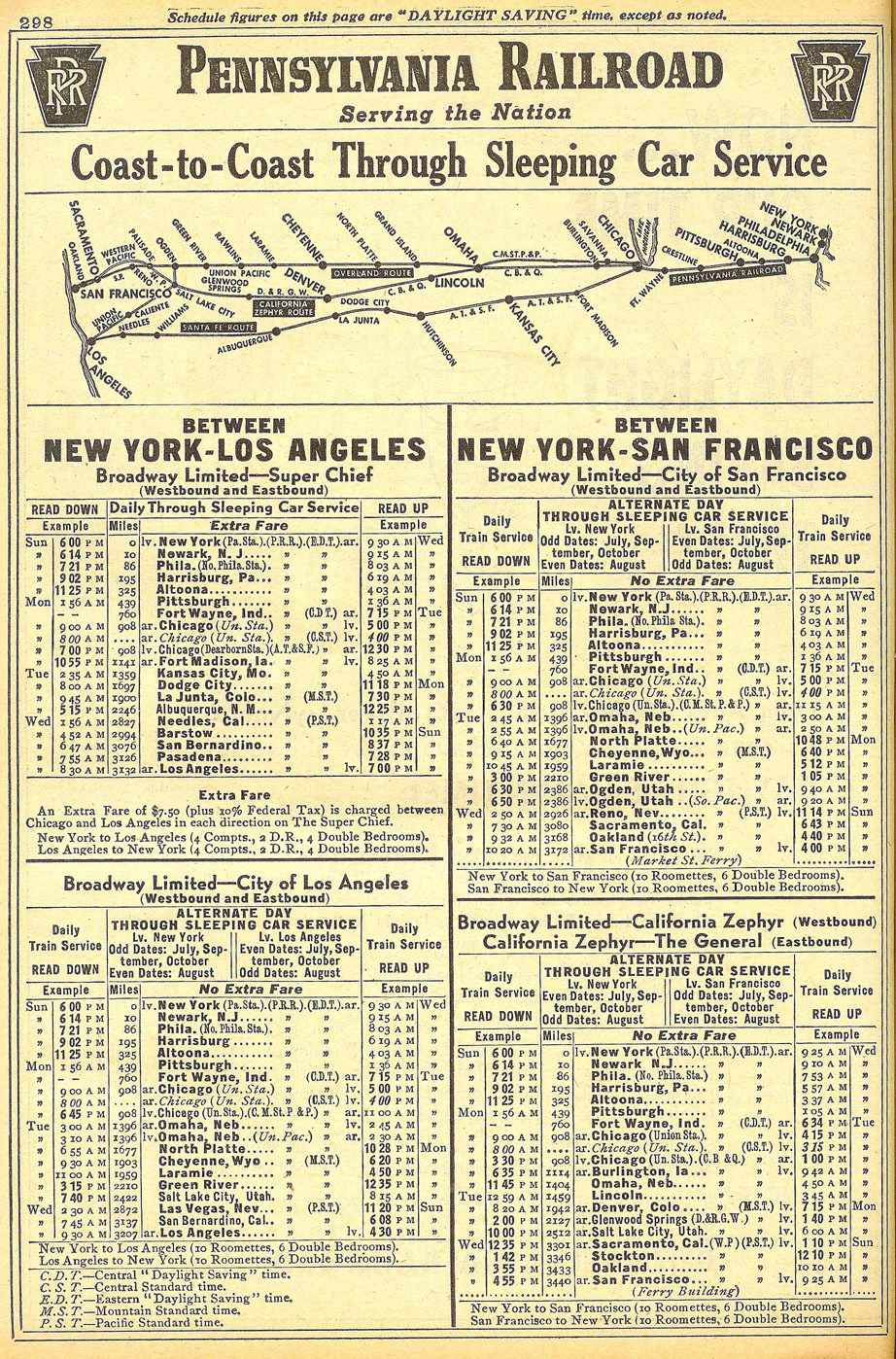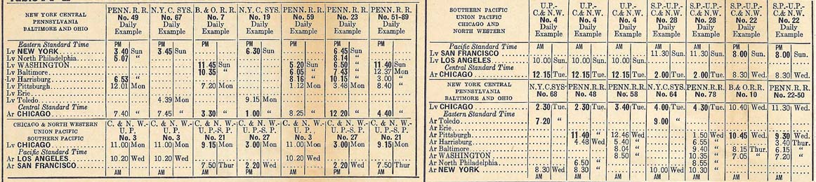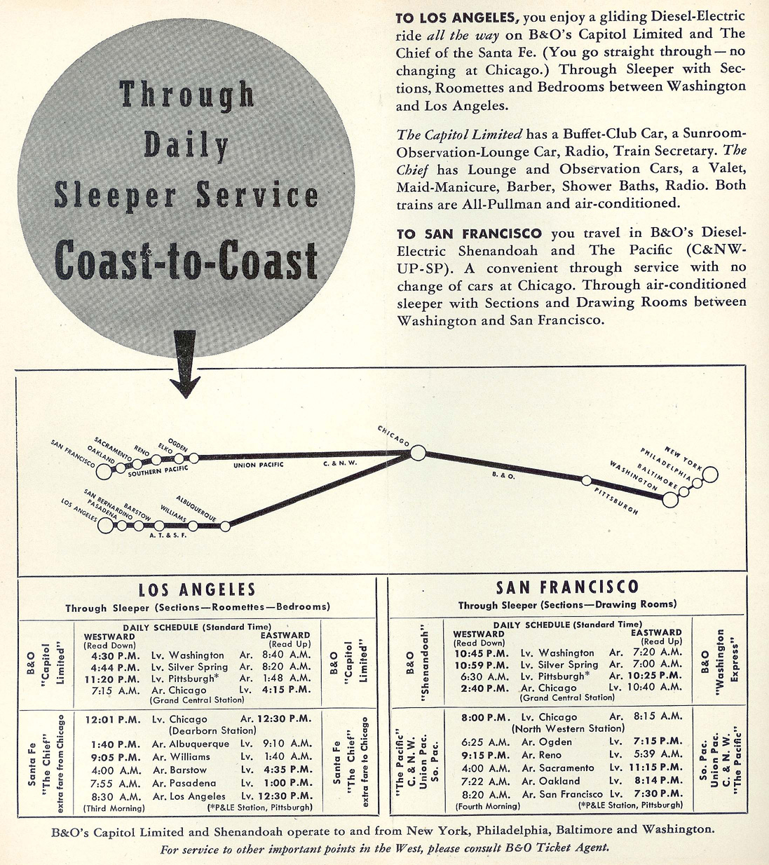 アメリカの大陸横断鉄道の多くは シカゴ に集結し、ここを直通する列車は皆無であったが、1946年中頃から、下記の大陸横断鉄道会社と東部への鉄道会社は、寝台車を直通することを始め ニューヨーク 、ワシントン(DC) から寝台車に乗ったまま乗り換え無しに サンフランシスコ、ロサンゼルス までいけるようになった。しかし、その期間は長くは無く、1959年4月の時刻表からはすでに消えている。