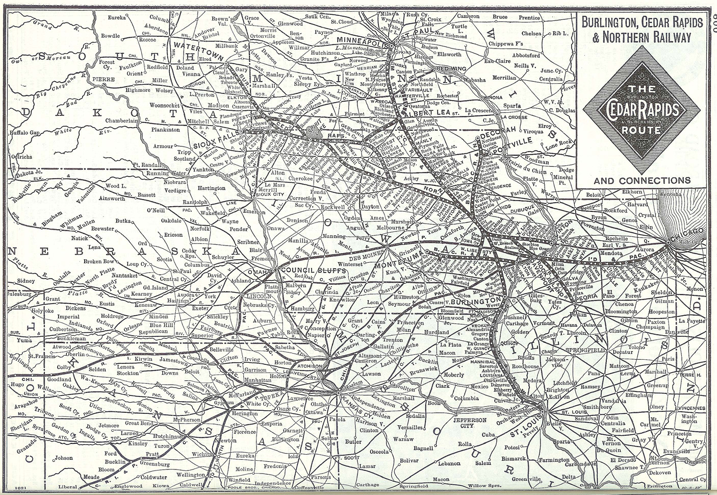 バーリントンから、シダーラッピヅを通って、ウォータータウン (Watertown, SD)、アルバートレア (Albert Lea, MN) へ路線を持ち、当初よりロックアイランド鉄道と関係が深く、1902年には999年間のリースを経て、実質的にロックアイランド鉄道の路線となった。