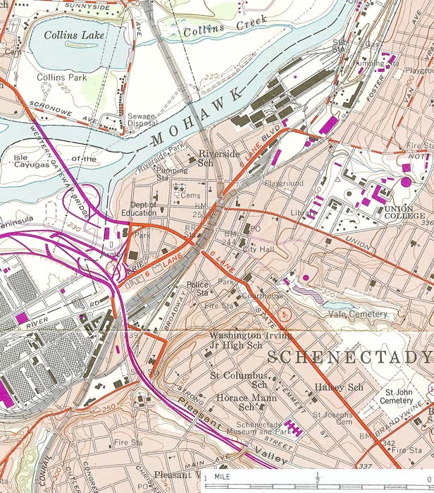 右:1978年測量 シラキュース 市内のワシントン街の路面軌道は 1936年に高架鉄道に変わり、1962年には、その高架鉄道も廃止されて高速道路になった。その後旅客駅はイースト・シラキュースに移ったが、近年、貨物線上、市街部の北にアムトラックの駅が移転した。