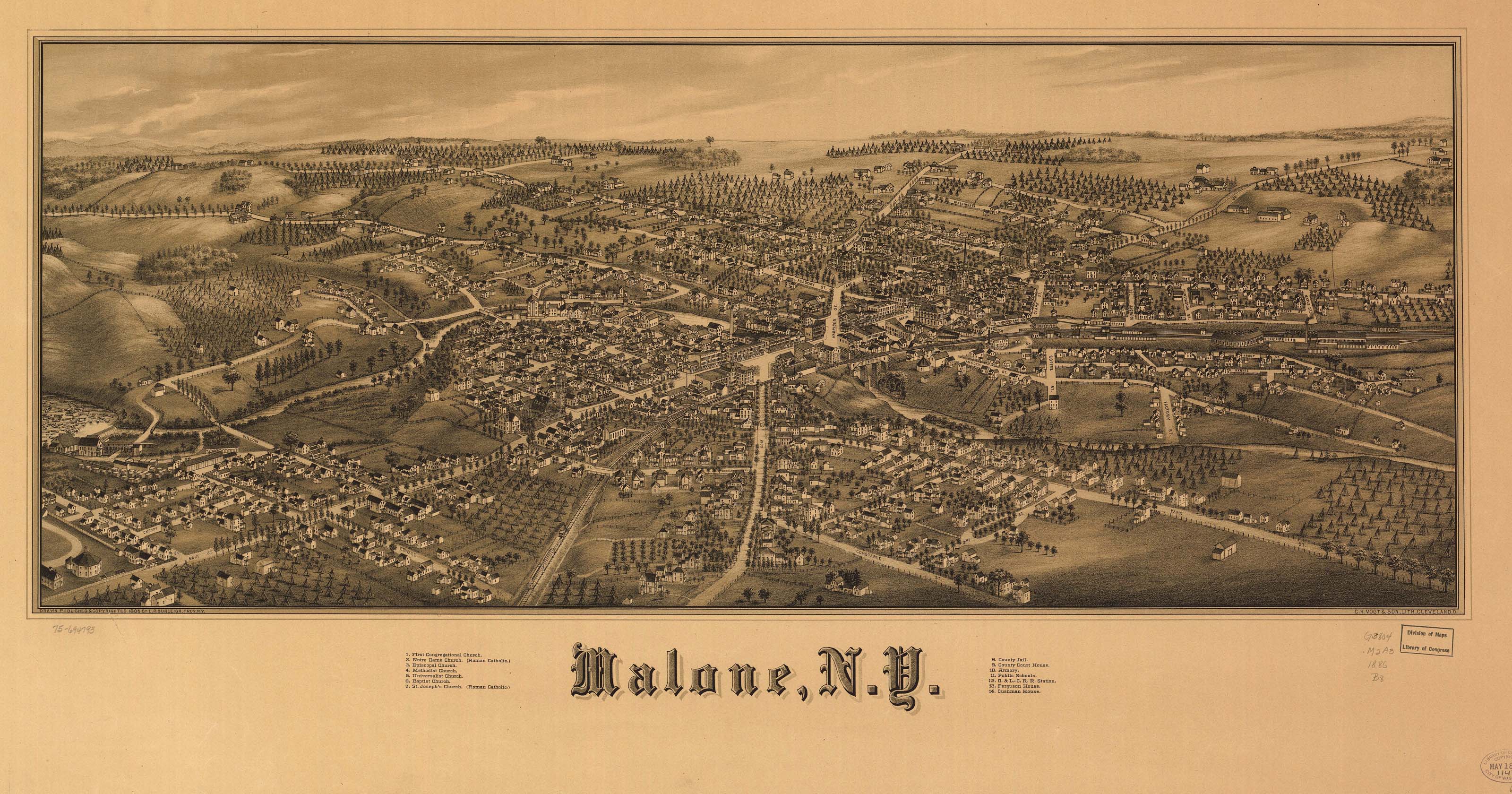 オグデンスブルグ から ローゼスポイント を経て ベニントン を結ぶ鉄道は ラトランド鉄道、ユーティカ から南北に モントリオール とを結ぶ鉄道は、ニューヨークセントラル鉄道、この二つの鉄道の交差点が、マローン (Malone) であった。交差点には、マローン・ジャンクション駅があり、ニューヨークセントラル鉄道では、ここを マローン駅 と呼んでいた。ラトランド鉄道は、ダウンタウンにも駅があり、それを マローン駅、交差点の駅を マローン・ジャンクション駅 と呼んでいた。ラトランド鉄道の マローン駅は、ノーザン鉄道 (Northern Railroad) によって 1850年に開通し、1865年 オグデンス鉄道 (Ogdensburg & Lake Champlain) によって建設された駅舎は 二つのタレット型の建物、その間に引かれたレール、その上のトレインシェッドからなっていた。今は線路は剥がされ、トレインシェッドも無くなってしまったが、二つのタレット型建物は残されている。