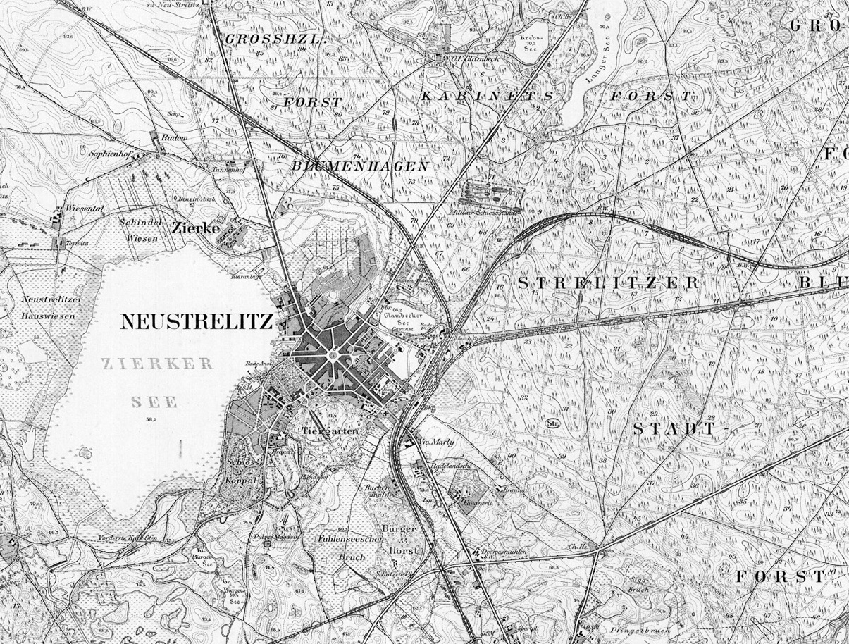 1890年に ノイシュテルリッツ = ミロウ(Mirow) 間に ノイシュテルリッツ・ベッセンベルグ・ミロウ鉄道(Neustrelitz-Wesenberg-Mirower Eisenbahngesellschaft)、1909年にはノイシュテルリッツ(Neusterlitz) = ブランケンゼー( Blankensee ) 間の国鉄路線に平行して独自の路線を開通させて、シュトラスブルグ(Strasburg)からの ブランケンブルグ・ボルデック・シュトラスブルグ鉄道(Blankensee-Woldegk-Strasburger Eisenbahngesellschaft) が、ノイシュテルリッツに乗り入れた。2つの鉄道会社は 1894年に合併し、メクレンブルグ・フリ−ドリヒ・ビルヘルム鉄道となった。1941年にはドイツ帝国鉄道に吸収されている。