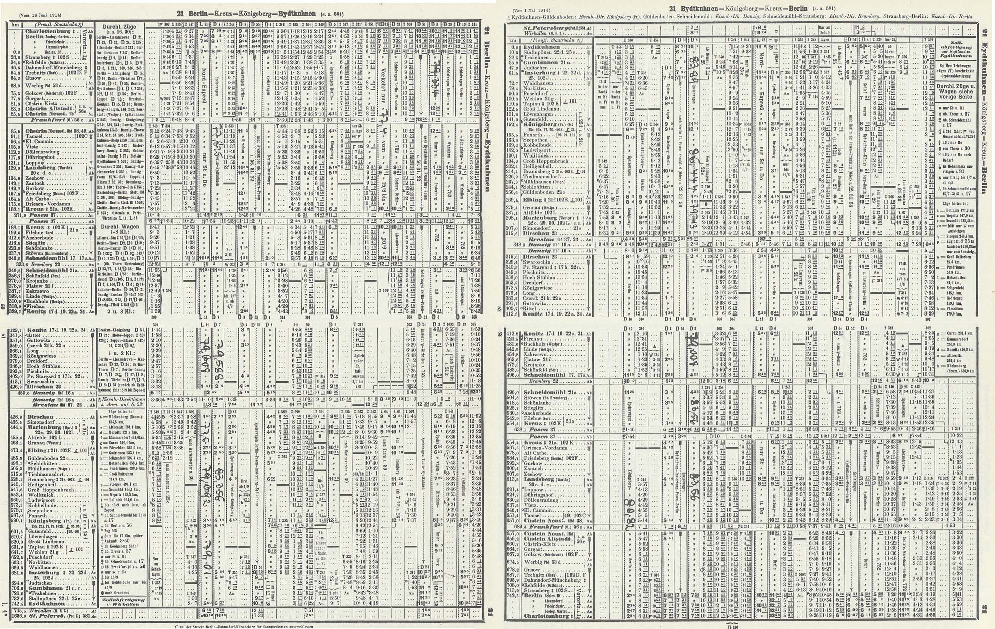 Dirchau では Danzig への連絡列車に接続していた。客車の一部が直通する列車もあり、D7, D8 列車は、Dirschau にて D27, D28列車と連絡し、Danzig発着の客車が、Berlin, Koenigsberg と直通していた。