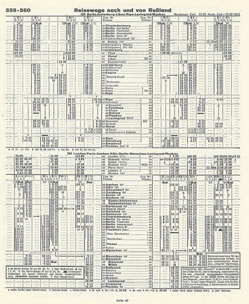 時刻表:ワルシャワ方面からの国際列車時刻(1935年ドイツ時刻表から)