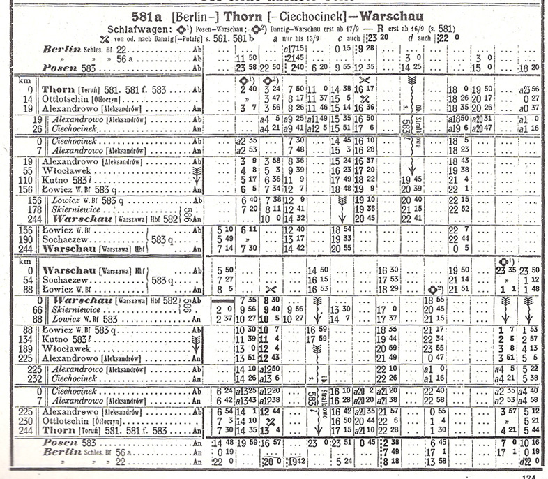 1927年時刻表 カリッシュ線の改軌後、Lowicz - Warszawa 間では、カリッシュ線経由、ウィーン線経由のどちらの直通列車も設定されていた。