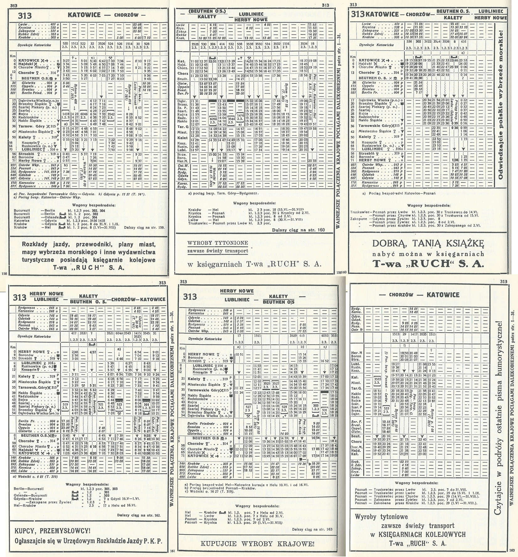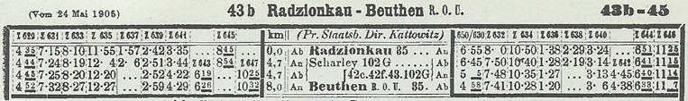 オーデル右岸鉄道(Rechte-Oder-Ufer Eisenbahn)は、ブレスロウ(Breslau, Wroclaw)とオーストリア領のジエジッツ(Dzieditz, Czechowice-Dziedzice)を結ぶ鉄道で、両端から順次開業し、1868年には、ブレスロウ、オエル(Oels, Olesnica) 、クルスブルク(Kreuzburg, Kluczbork) までの区間、南側は、ジエジッツから、チッチャウ(Tiechau, Tychy)、ショピニッツ(Schoppinitz, Szopienice)経由で、ビュウセン(Beuchen, Bytom)、タルノビッツ(Tarnowitz, Tarnowskie Gory)までを開業した。1884年には、両方の路線が連結され、タルノビッツでは、上シュレジア鉄道(Oberschlesische Eisenbahn)の支線とも接続していた。オーデル右岸鉄道の本線は、シャルーリー(Schrley)を経由して、上シュレジア鉄道(OSE)の線路をオーバークロスしていた。ビュウセン(OSE)駅はグライビッツ(Gleiwitz, Gliwice) からの路線が開通した 1872年に設置されている。1900年には、カルフ(Karf, Bytom Karb)とビュウセン(OSE)との間の短絡線が完成し、ROUEオリジナルのルートは支線になり、ROUEの本線ルートはビュウセン(OSE)駅を使うようになった。このときROUEの駅は、ビュウセン西(Beuthen West)と改称された。