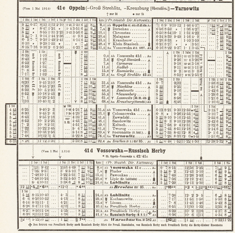 オポールから上シュレジア地域へは、上部シュレジア鉄道の本線が1845年に開業した後、1858年には オッペルン・タルノビッツ鉄道(Oppeln-Tarnowitzer Eisenbahn)による路線がタルノビッツまで開業、1859年には、上シュレジア鉄道の支線と接続されてビューセンとを結んだ。途中の Vossowska では、1894年に プロイセン・ロシア国境の Herby からの路線が到達し、1911年には、ロシア側の鉄道も開通して、Czestochowa で、ワルシャワ・ウィーン鉄道に接続した。