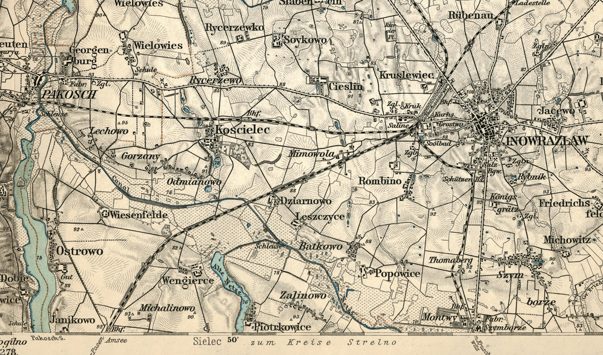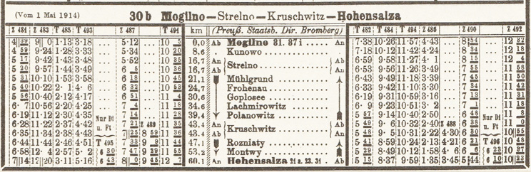 ポーゼン・ブロンバーグ・トルン鉄道(Posen Bromberg Thorner Eisenbahn)によって、ポーゼンからホエンザルザ経由、ブロンバーグへの路線が 1872年5月26日に開業し、此処で分岐するトルンへの路線が1873年3月25日に開業した。当時のプロイセンとロシアの国境線が南東約25Kmの地点を通っており、ホエンザルザ‐モギルノ(Mogilno)間で、国境地帯を回り込む鉄道が、1889年から1908年にかけてプロイセン国鉄によって建設された(1914年時刻表)が、ヴェルサイユ体制で国境線がなくなった後は重要性も薄れ運転回数も減っている。1933年には、南北方向の石炭幹線が、イノブロツワフを通るようになり、かつての国境方面のローカル線も石炭幹線の一駅目からの分岐となり、路線の一部が付け替えられている。(1883年地図、1978年地図)