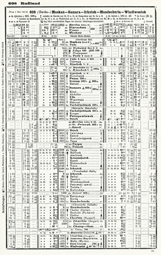 右:シベリア鉄道時刻表 1914 ドイツ時刻表より