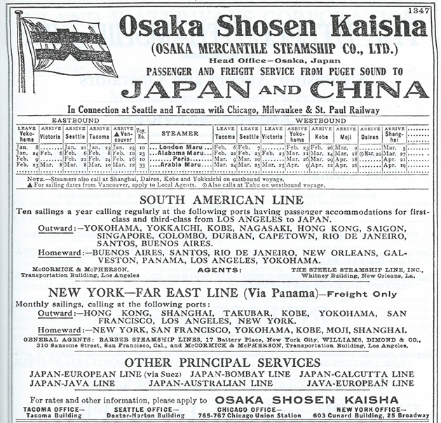 大阪商船とミルウォーキー鉄道は貨物連携の独占契約を結び、1909(明治42)年7月、新造船 たこま丸が香港を出港し、マニラ、上海、長崎、門司、四日市、横浜、ビクトリア、シアトルに寄港して、タコマに向かった。大阪商船タコマ航路の運航が始まりであった。タコマでの貨物受け渡しが基本であったが、生糸だけはシアトルで積替え、ニューヨークに急送されていた。1931(昭和6)年、日本郵船との郵商協定の結果、大阪商船はタコマ航路から撤退することとなった。