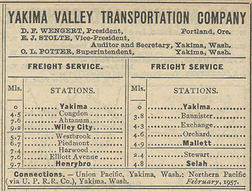 ユニオンパシフィック鉄道が子会社ヤキマ渓谷交通(Yakima Valley Transportation Company)をヤキマ市に1985年寄付したのを受けて、1989年から観光を目的に運行を始めたのがヤキマ地方交通線である。夏の間、主として週末に1時間間隔でヤキマ市内の西3番街西パイン街にある車庫から、隣町のセラー(Selah)までを約1時間で往復運行をしている。車両はポルトガルのオポルト(Oporto,