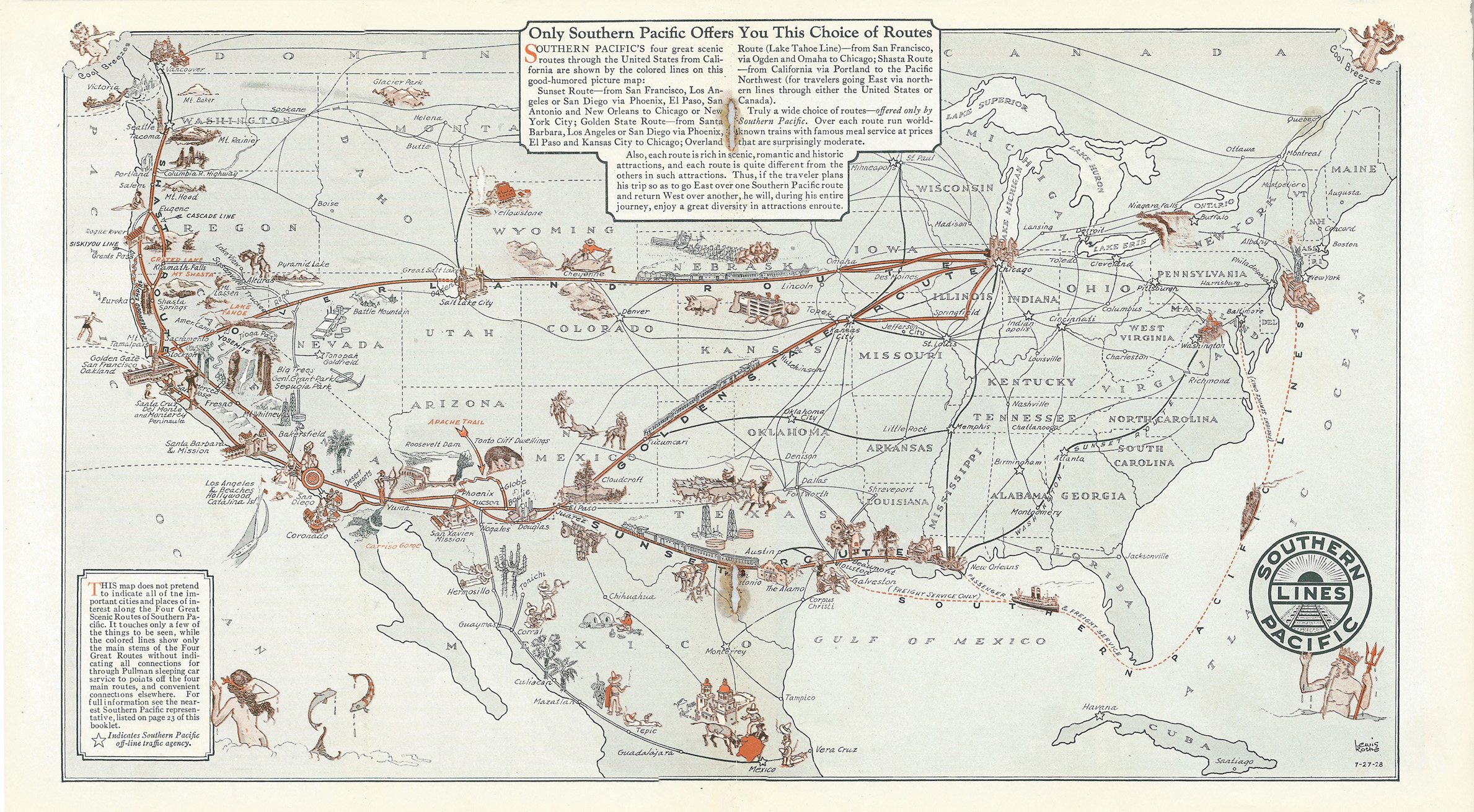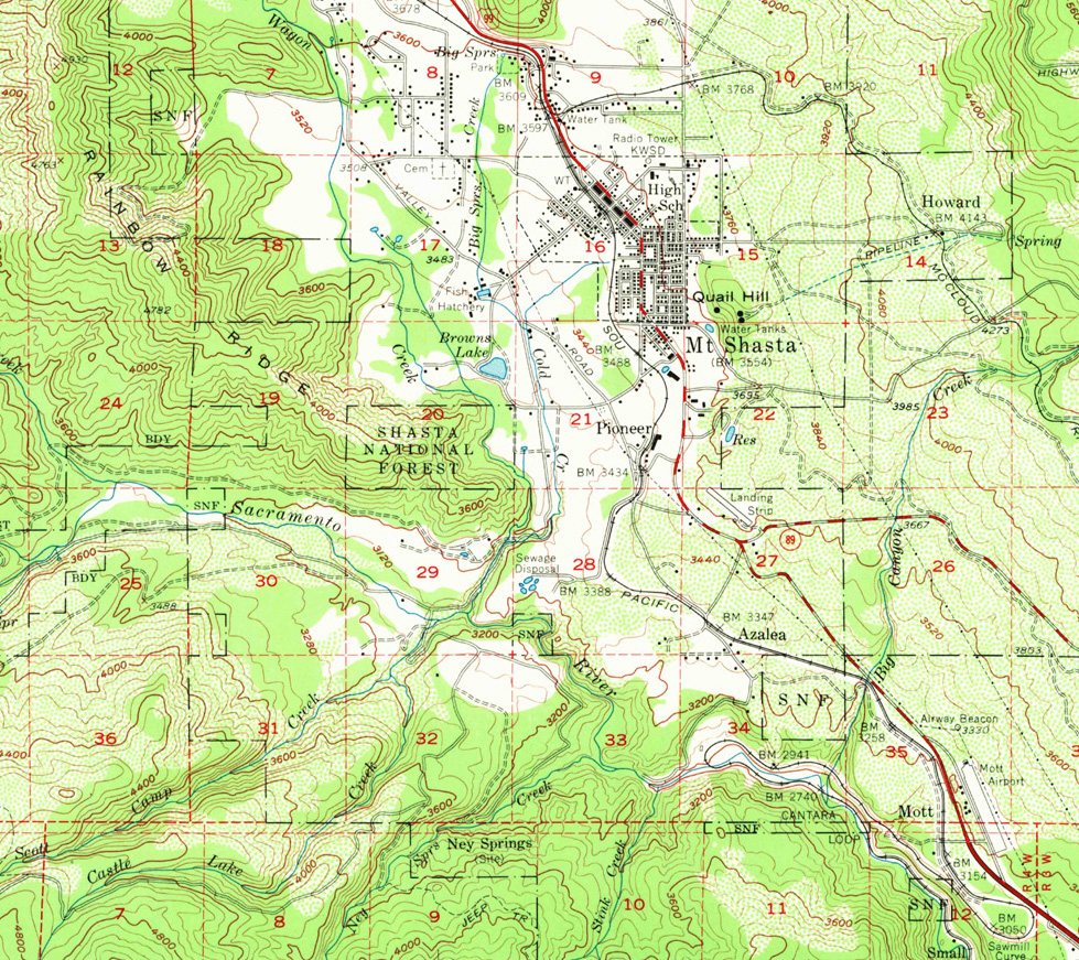 セントラル・パシフィック鉄道の 本線上の ローズビル(Roseville, ex-Junction)から分岐し、メアリースビルを経由する オレゴン線 (Oregon Division line)は、レッディイング(Redding)まで 1872年に開通していた。また、カリフォルニア・パシフィック鉄道のディビス(Davis)から分岐した ウェスト・サイド線(West Side Line) は、1882年に テハマ(Tehama) でオレゴン線に接続された。そのオレゴン線は更に北へ、1887年にはカリフォルニア・オレゴン州境を越え、Ashland, OR でポートランドからのオレゴン・カリフォルニア鉄道(Oregon & California Railroad)と接続されて、シャスタ・ルートが全通した。1927年には、勾配の急なシスキヨウ線(Siskiyou Line)の東側に カスケード線(Casecade Line, Natron Cutoff)を増設して勾配緩和、20マイルの距離短縮、急曲線の削減が実現した。