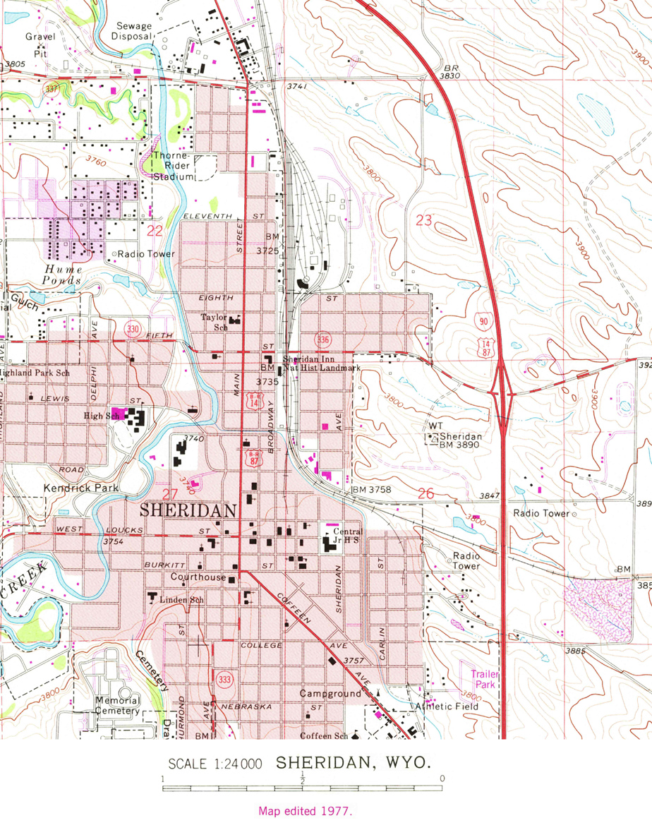 バーリントン鉄道はアライアンス(Alliance,NE)からの路線を1892年にシェリダン(Sheridan,WY)まで開通させた。更に北へは 1893年に建設がはじめられ、1894年、ハントゥリー(Huntley)にてノーザンパシフィック鉄道(Northern Pacific Railroad)に接続され、ビリングス(Billings)まで列車が乗り入れることになった。シェリダンの初代の駅舎は 1892年 の開業時に作られた木造2階建てもので、2代目は 1912年 先代の駅舎を曳家方式で移動して場所を開けて建設された煉瓦造り2階建てである。どちらも現存している。